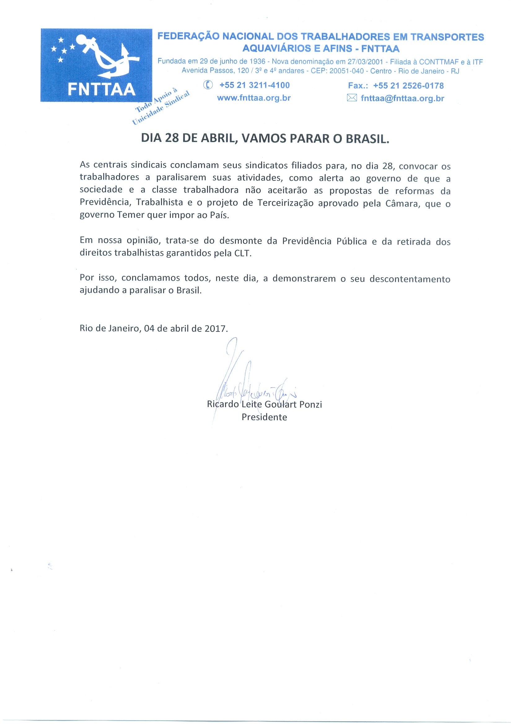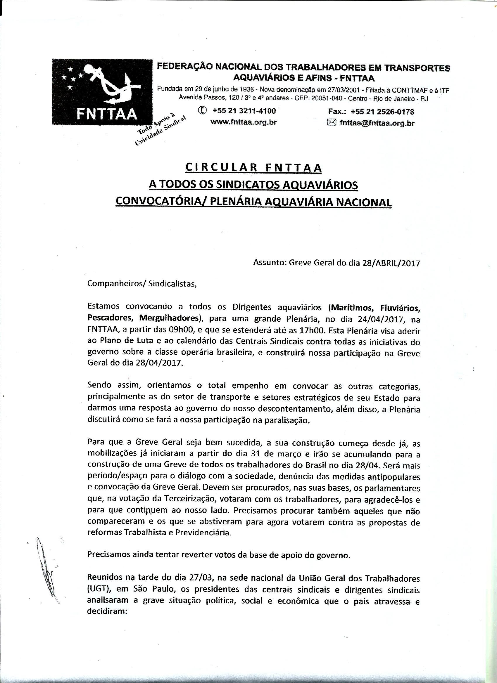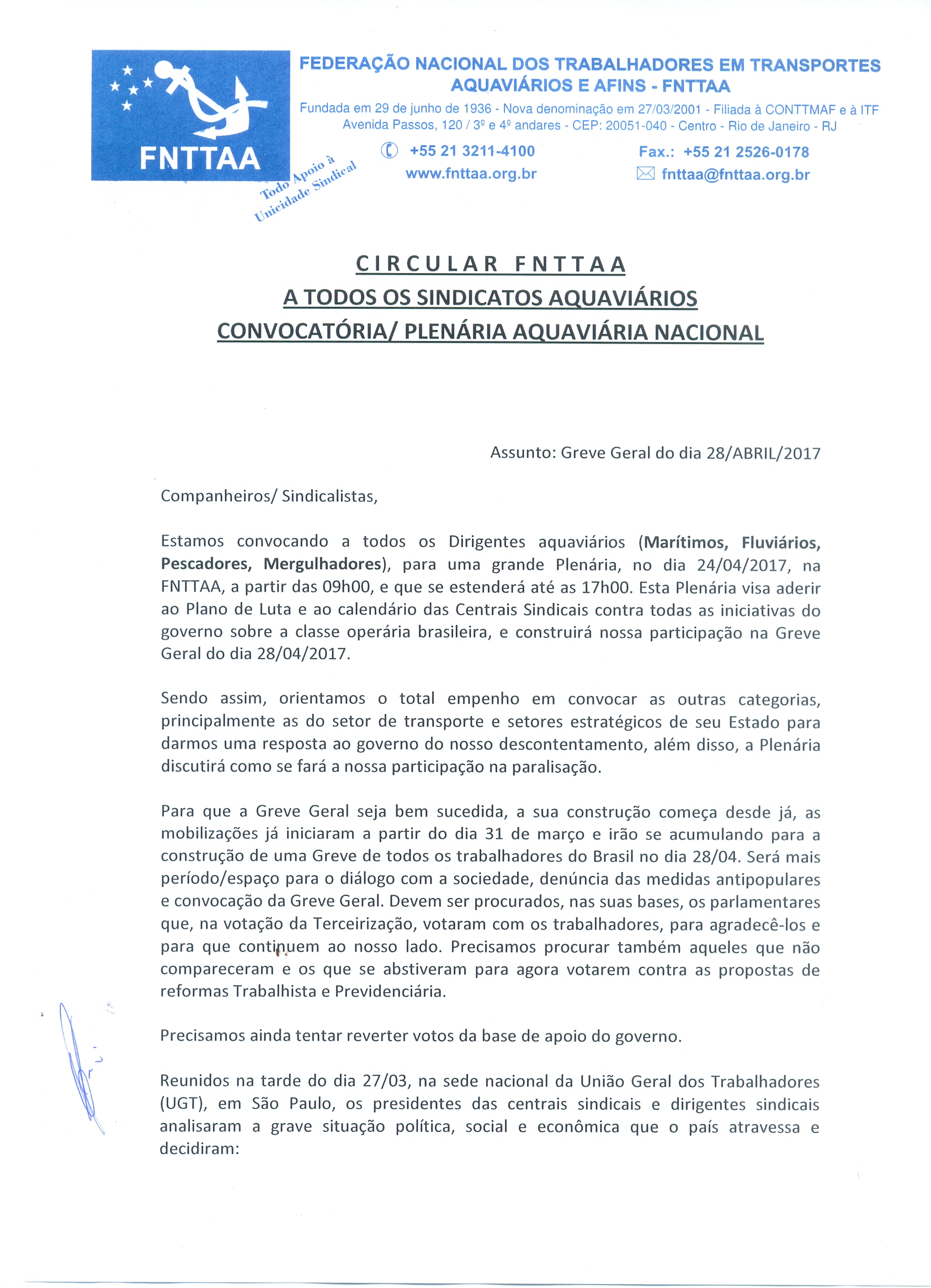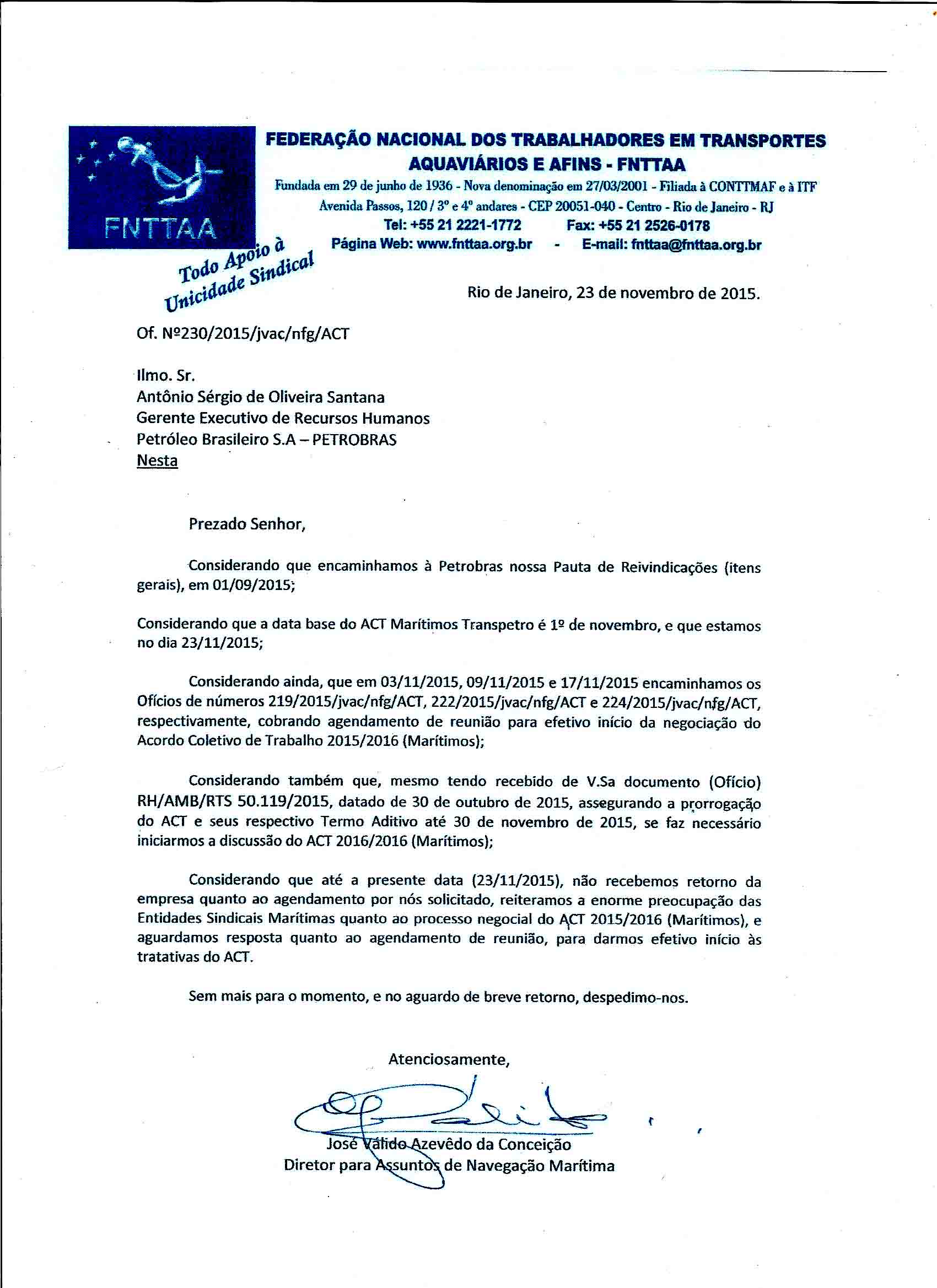 Sem sombra de dúvida, podemos afirmar que a condição alcançada na última negociação, só foi possível com a disposição dos marítimos para lutar coletivamente, seguindo as orientações dos Sindicatos Marítimos. É preciso levar em consideração que os avanços obtidos no último ACT impactarão a negociação atual e nos trarão desafios. Isso exigirá mais uma vez que os marítimos mantenham sua disposição de mobilização e estejam em sintonia com as Entidades Sindicais. As reivindicações de bordo deverão ser enviadas preferencialmente de forma coletiva através do e-mail act@conttmaf .org.br, até o dia 31/08/2023, quinta-feira, às 12h00, impreterivelmente, para sistematização e encaminhamento às empresas. Cabe informar que tal prazo não será prorrogado. Ressaltamos que a negociação abrange os Oficiais, Suboficiais e Guarnição, que negociam no âmbito da FNTTAA, exceto Condutores e Contramestres. A efetiva participação e mobilização será necessária para possibilitar alcançar um ACT mais justo que traga avanço em relação ao ACT em vigor. Juntos somos mais fortes! Unidade e luta! Despedimo-nos com as já tradicionais Saudações Marinheiras. Assinam o original deste documento: Confederação (CONTTMAF), Federação (FNTTAA), Sindicato Nacional dos Oficiais da Marinha Mercante (Sindmar), Sindicato Nacional dos Oficiais de Radiocomunicações da Marinha Mercante, Sindicato Nacional dos Enfermeiros da Marinha Mercante, Sindicato Nacional dos Taifeiros, Culinários e Panificadores Marítimos, Sindicato Nacional dos Marinheiros e Moços em Transportes Marítimos e Sindicato Nacional dos Marinheiros e Moços de Máquinas em Transportes Marítimos e Fluviais.