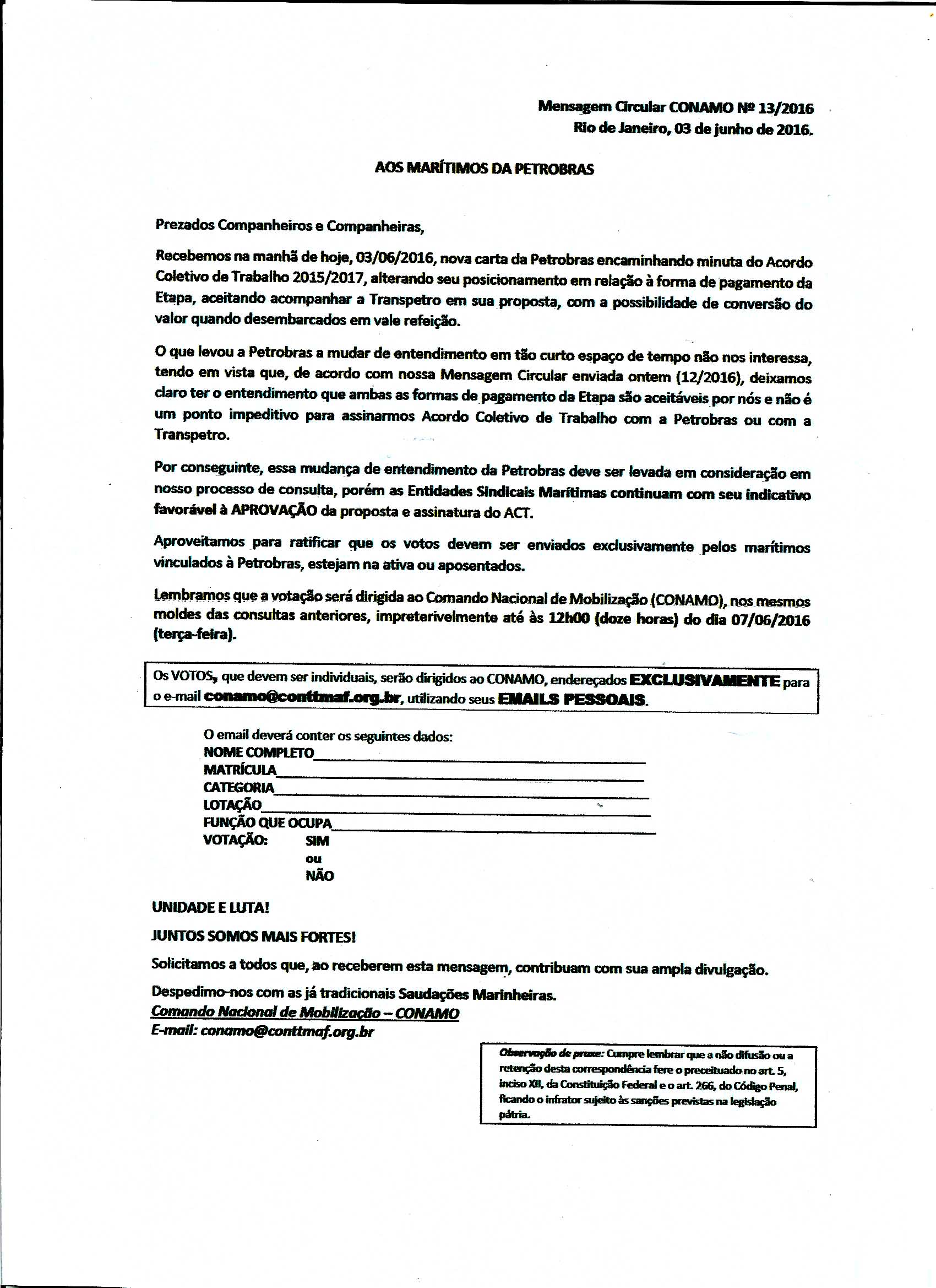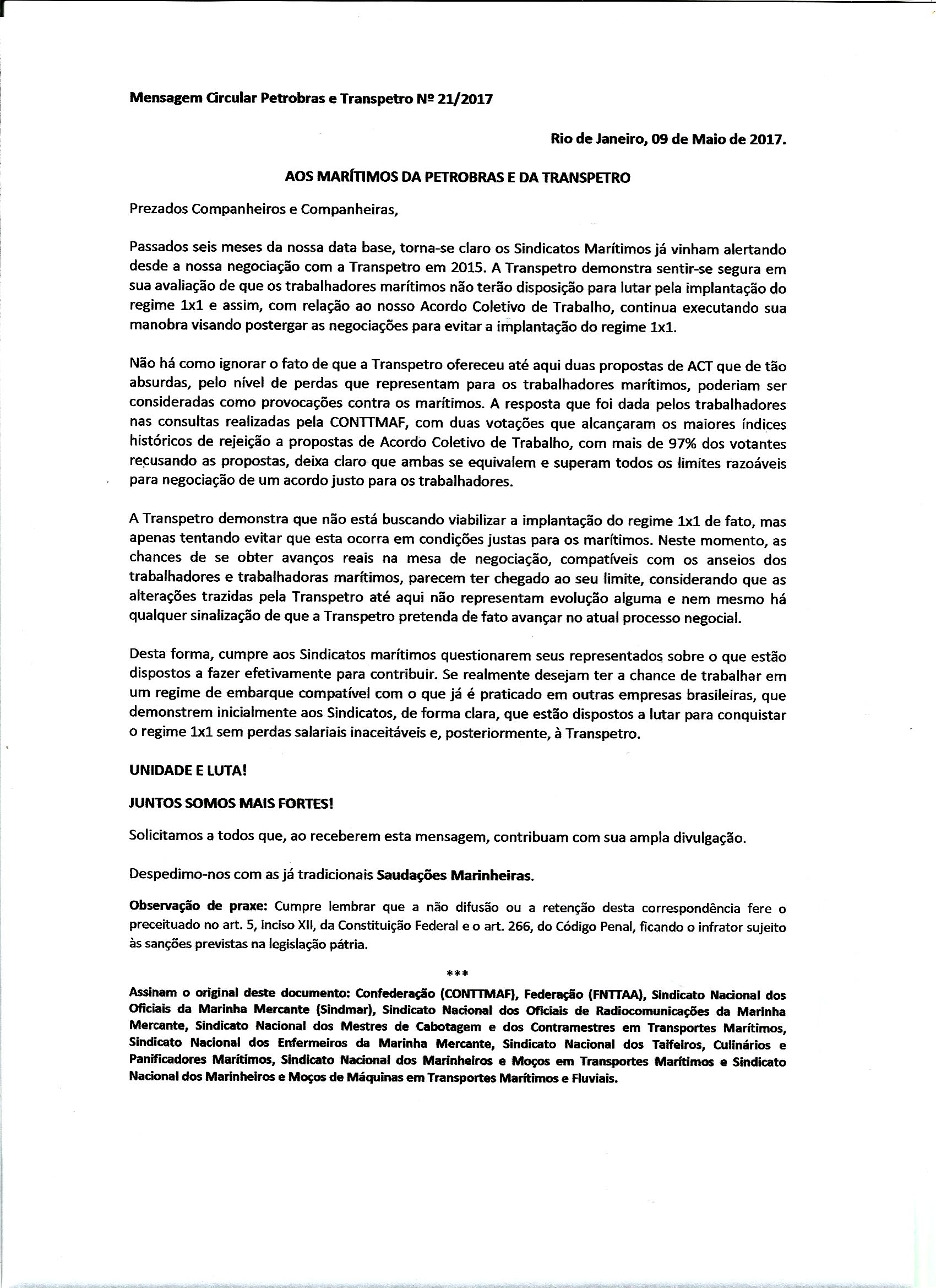 Prezados Companheiros e Companheiras, Solicitamos aos Comandantes que reúnam suas tripulações e, de forma democrática, registrem e nos encaminhem os legítimos pleitos e anseios do corpo funcional marítimo, para elaboração de pauta reivindicatória única, que será submetida à apreciação das empresas, a fim de que possamos iniciar efetivamente as negociações para o Acordo Coletivo de Trabalho 2023/2025 com a Petrobras e a Transpetro. Todos os marítimos do sistema Petrobras podem enviar suas reivindicações, sejam sindicalizados ou não, se trabalham embarcados ou em terra, ou mesmo que estejam no local de trabalho, em repouso, férias, afastamento médico, treinamento, recebimento de navio novo ou em qualquer outra situação. Considerando que os Sindicatos também representam os aposentados, não há impedimento para que enviem sugestões, considerando que na Petrobras o reajuste da aposentadoria do Plano Petros depende do reajuste oferecido aos ativos. As reivindicações serão analisadas e sistematizadas em uma pauta para cada empresa, refletindo os legítimos anseios e traduzindo a vontade de nossos representados. Ao final da última negociação, avaliamos que alcançamos um ACT com as cláusulas mais vantajosas para o conjunto do corpo funcional marítimo da Transpetro, dentre todos os acordos firmados pelas Entidades Sindicais, desde a fundação da empresa em 1998. Dentre os avanços obtidos, destacamos o avanço nas três reivindicações essenciais definidas no início da negociação: Reajuste do INPC mais ganho real para alcançar o nível salarial das demais empresas Reajuste do Vale Alimentação para valores condizentes com a prática no setor Pagamento de dobra no período embarcado que exceder o embarque regular O ganho real foi obtido com o avanço em um pleito histórico que foi a implantação de um Plano de Cargos e Salários que ampliou a possibilidade avanço salarial e permitiu a correção da defasagem que existia em relação aos salários praticados pelas demais empresas da cabotagem. Em paralelo à negociação as Entidades sindicais marítimas conseguiram barrar a intenção de venda de cinco navios Suezmax, evitando a concretização da transferência de navios que iriam desfalcar a frota e reduzir o número de postos de trabalho na Transpetro.