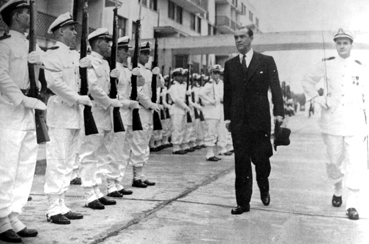 Presidente Juscelino Kubitshek, visitando a Escola de Oficiais da Marinha Mercante do Rio de Janeiro. EMMRJ.